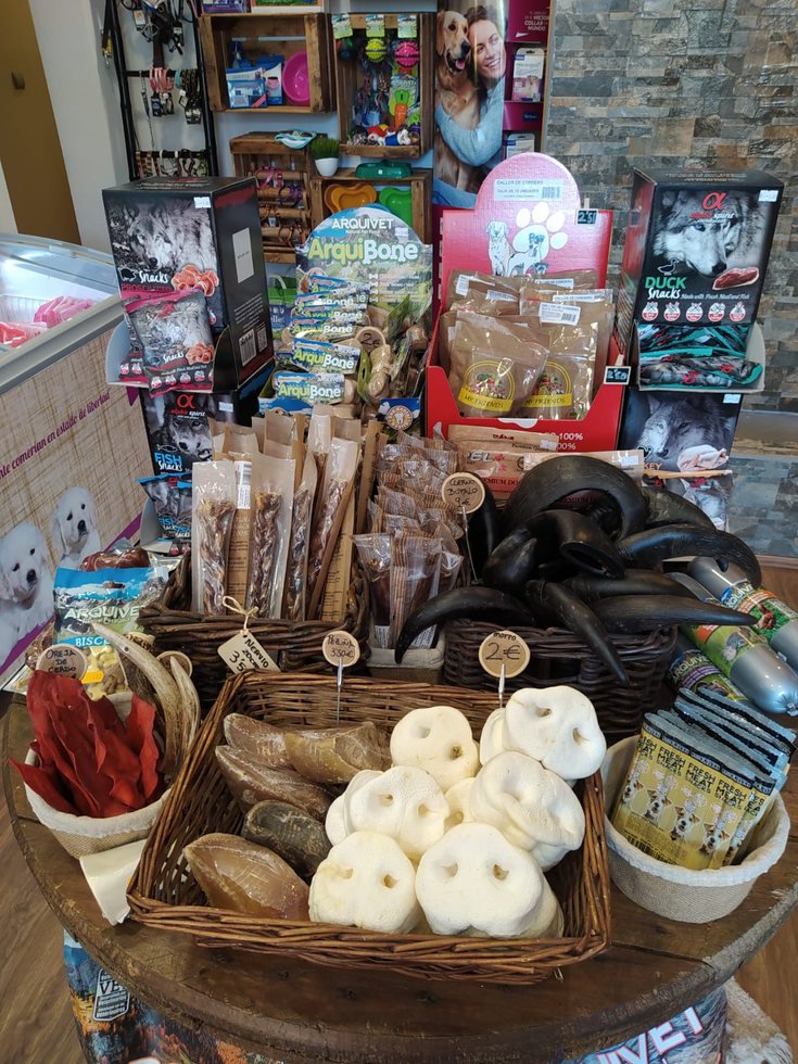 -Alimentación: Piensos naturales de diferentes sabores, comidad húmeda, salchichas, gran variedad de chucherías naturales...